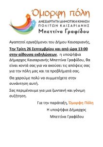 Η Μπεττίνα Γραφίδου θα βρεθεί σήμερα στο Δημαρχείο Καισαριανής για μια συζήτηση με τους εργαζόμενους και τα προβλήματα που αντιμετωπίζουν .
