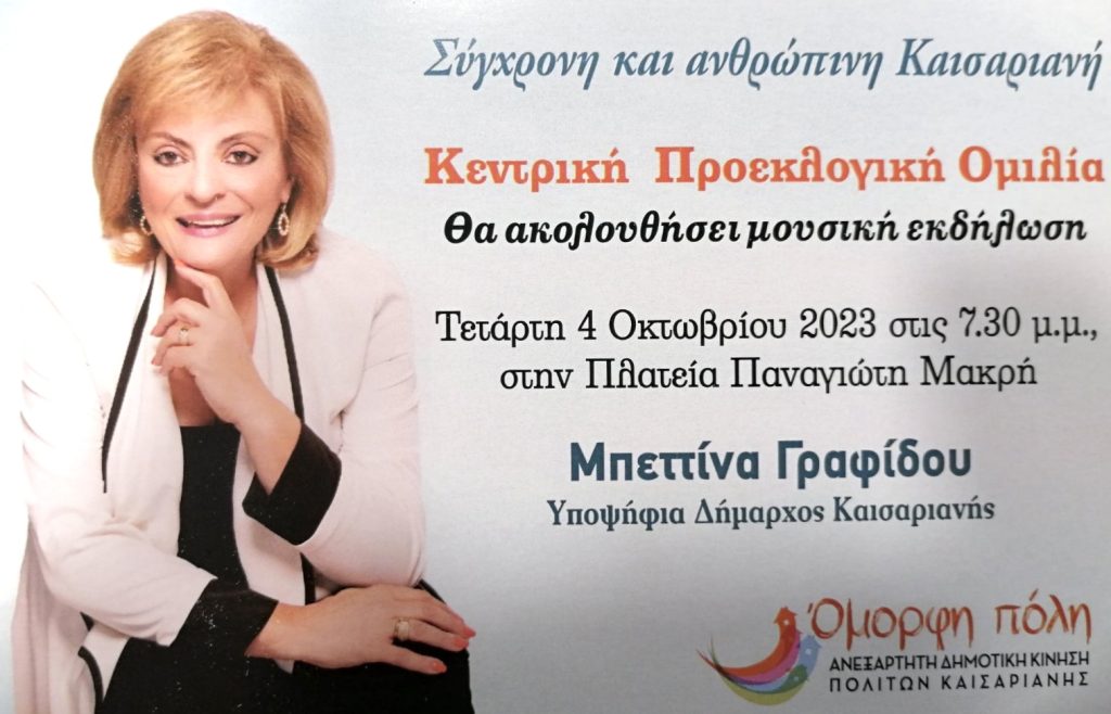 Την Τετάρτη 4 Οκτωβρίου και ώρα 7:30 μ.μ  σας προσκαλούμε στην κεντρική ομιλία της υποψήφιας Δημάρχου Καισαριανής Μπεττίνας Γραφίδου στην Πλατεία Παναγιώτη Μακρή . Θα ακολουθήσει μουσική εκδήλωση .